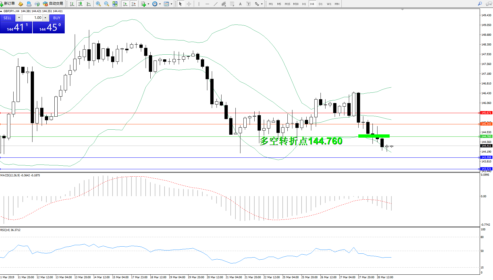 交易策略:144.760下方看跌,目标143.958、143.521