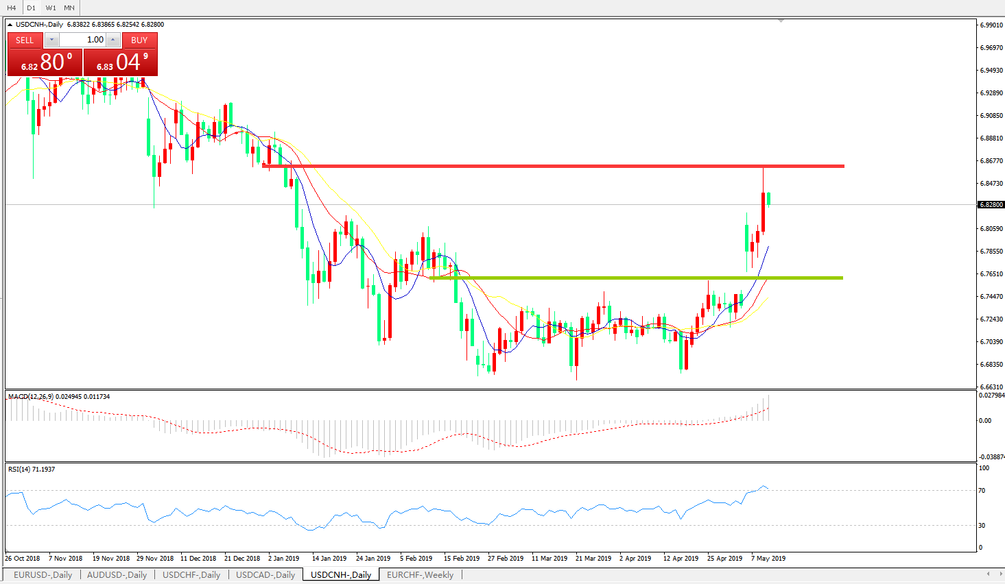 交易策略: 在6.7560之上,看涨,目标价位为6.8585,然后为6.9200。