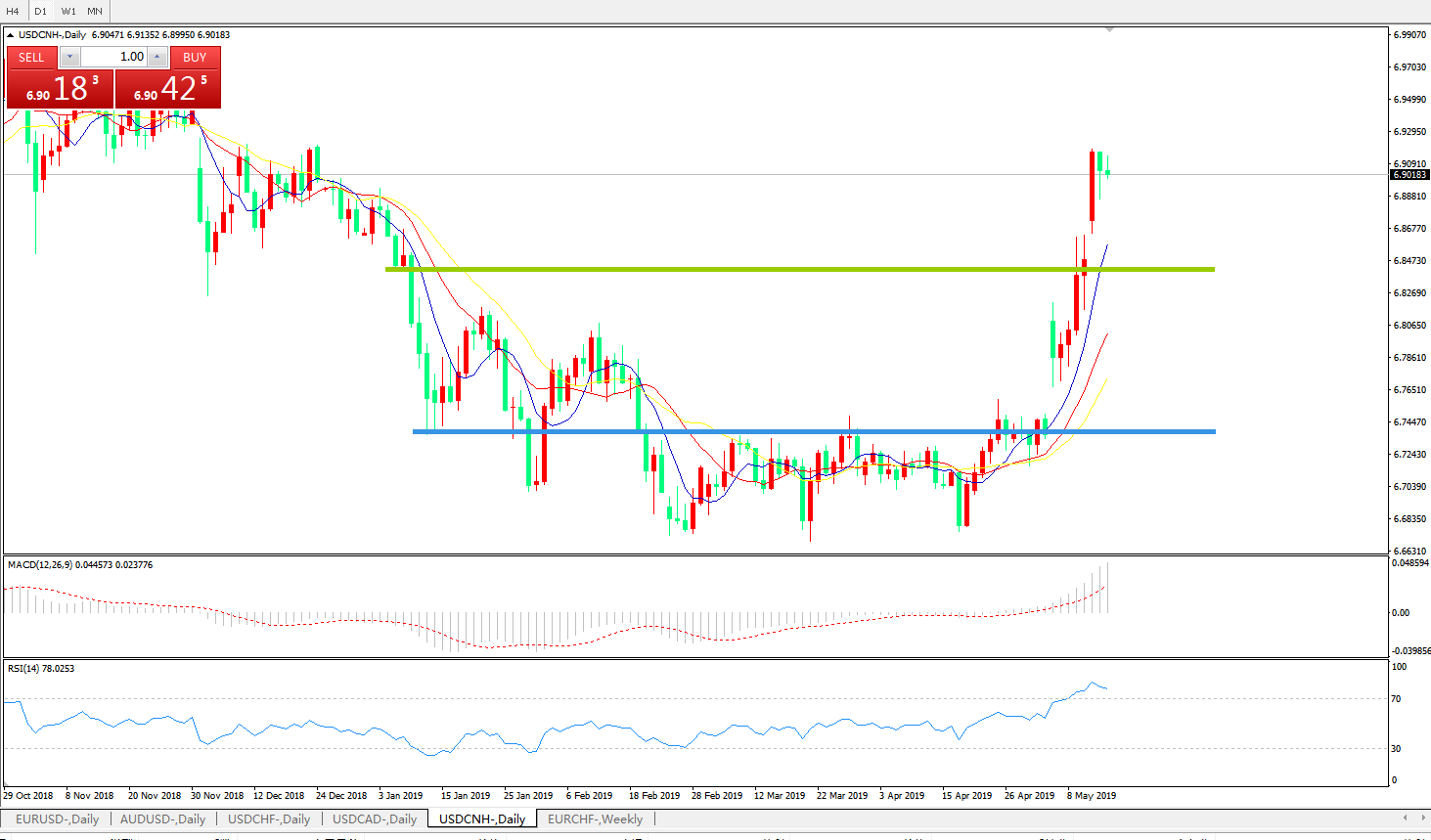 美元兑人民币USDCNH 日线图: