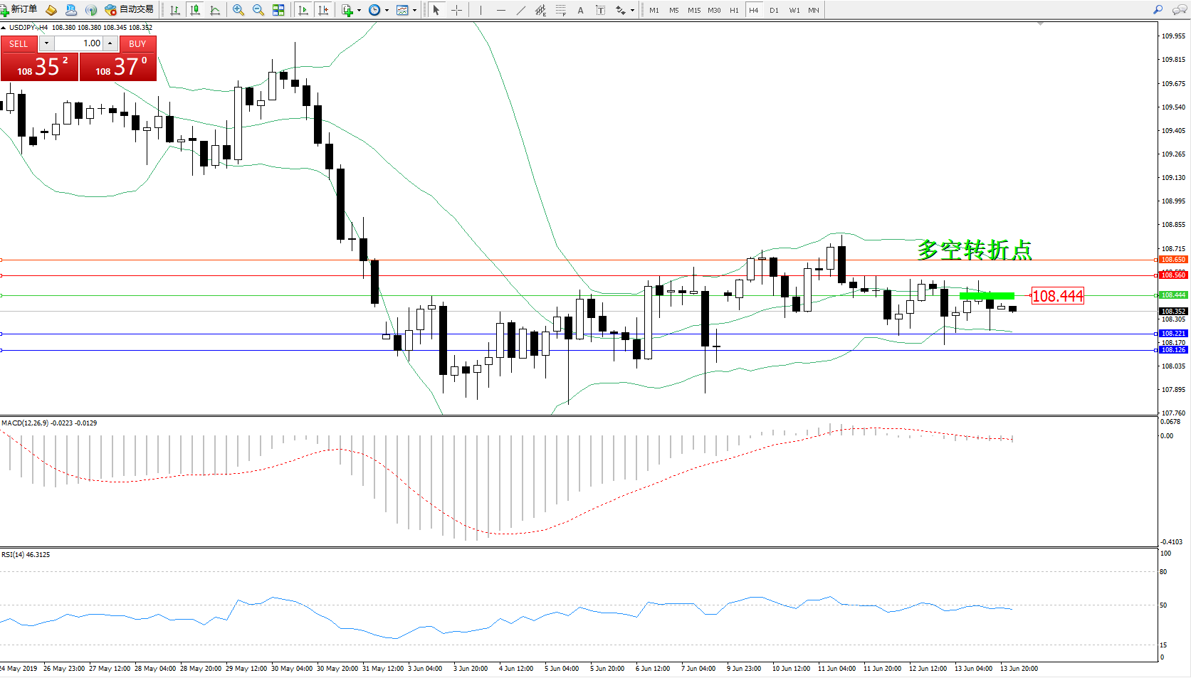 交易策略:108.444下方看跌,目标108.221108.126
