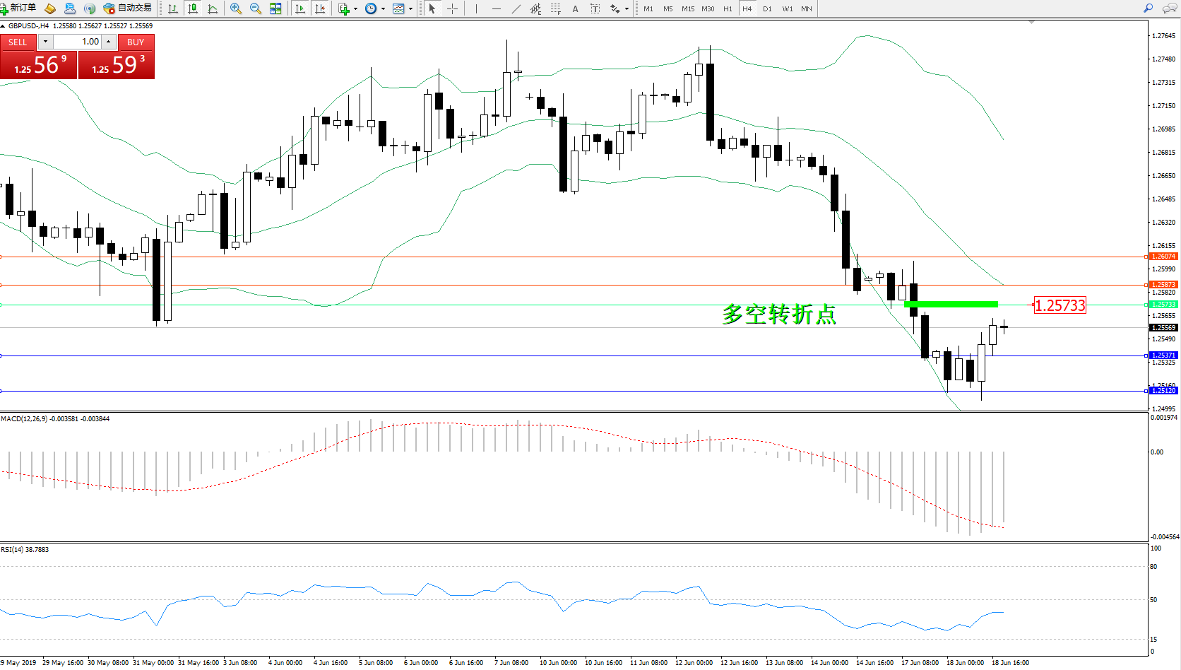 交易策略:1.25733下方看跌,目标1.25371、1.25120