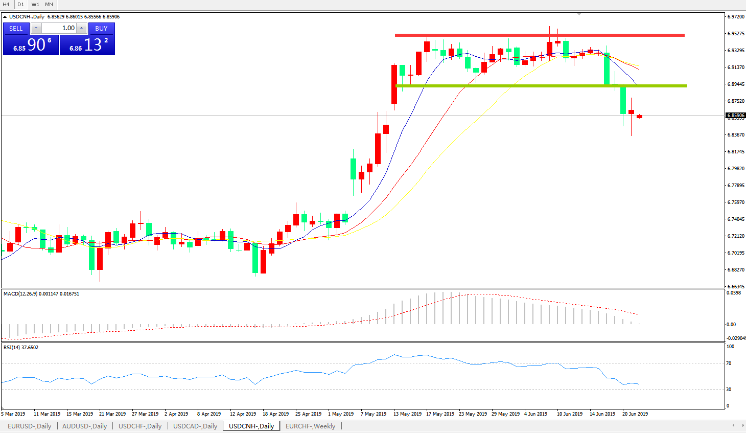 交易策略6.8880之下,看跌,目标价位为6.8100,然后为6.7600