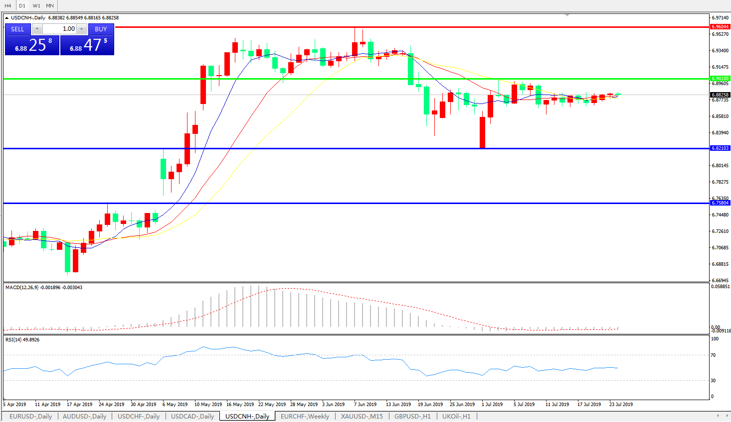 交易策略: 在6.9010之下,看跌,目标价位为6.8210,然后为6.7580。