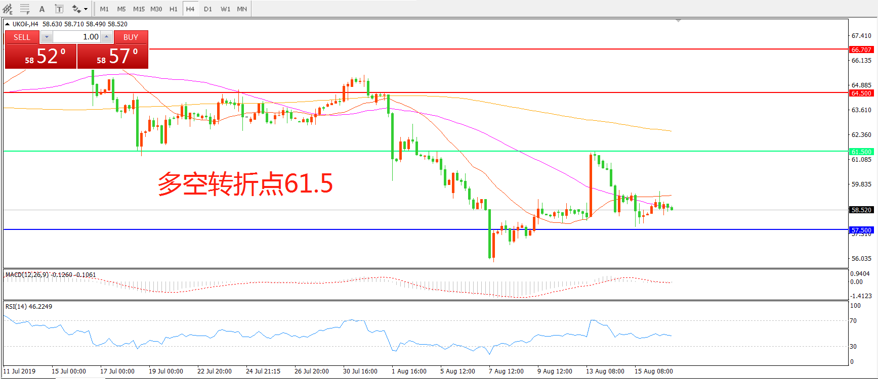 4小时图看,油价呈现窄幅震荡形态,55周期均线成为上方阻力,整体走势偏弱,57.5成为下方支撑,MACD红柱减少, RSI指标走平,日内震荡下行概率较大。