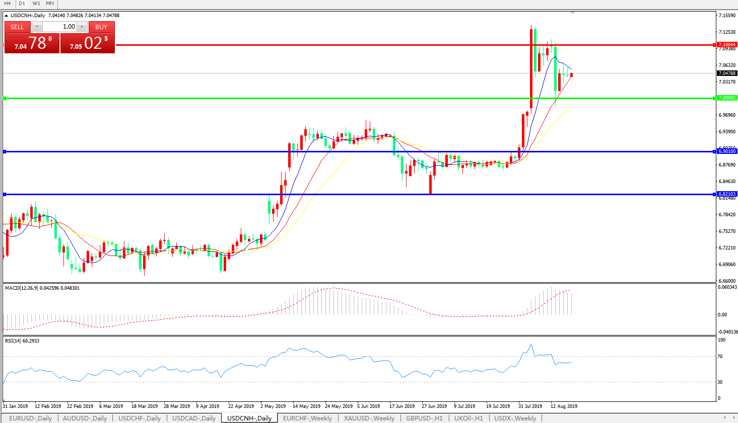 备选策略: 在7.0000之下,看跌,目标价位为6.9010,然后为6.8210。