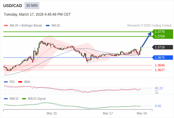 美元/加元 当日内 : 看涨,当 1.3675 为支撑位。