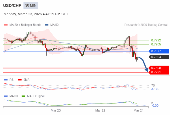 美元/瑞郎 当日内 : 看跌,在 0.7877 之下。
