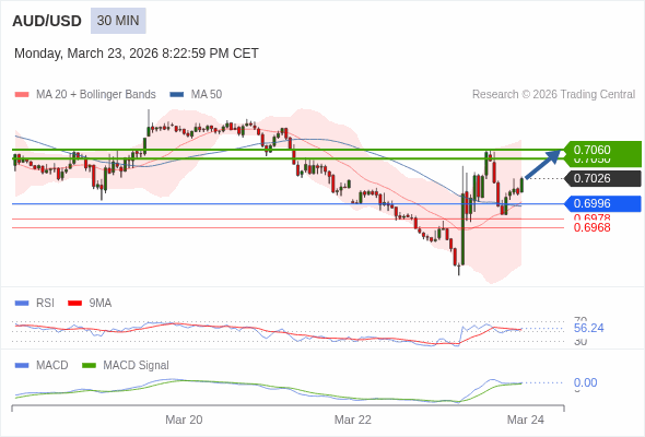 澳元/美元 当日内 : 看涨,当 0.6996 为支撑位。