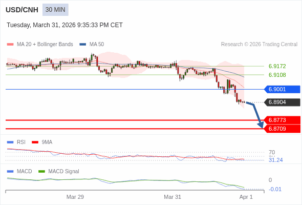 美元/人民币 当日内 : 看跌,在 6.9001 之下。