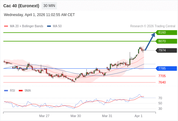 在 7785 之上,看涨,目标价位为 8070 ,然后为 8160 。