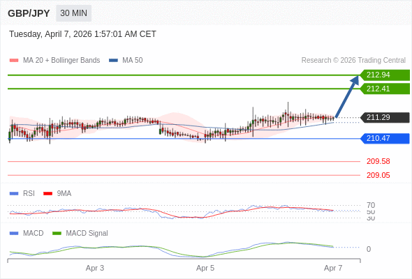 英镑/日元 当日内: 看涨,当 210.47 为支撑位,目标定在212.94。