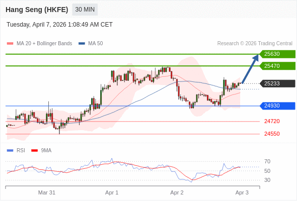 香港恒生指数期货 当日内: 在24930之上,看涨。