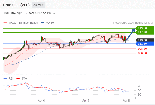 在 111.50 之上,看涨,目标价位为 117.30 ,然后为 119.50 。