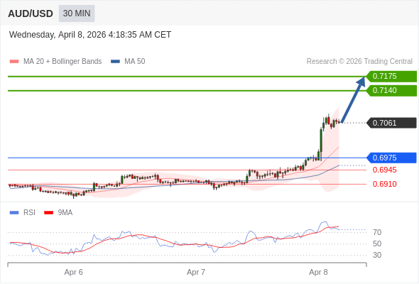 在 0.6975 之上,看涨,目标价位为 0.7140 ,然后为 0.7175 。