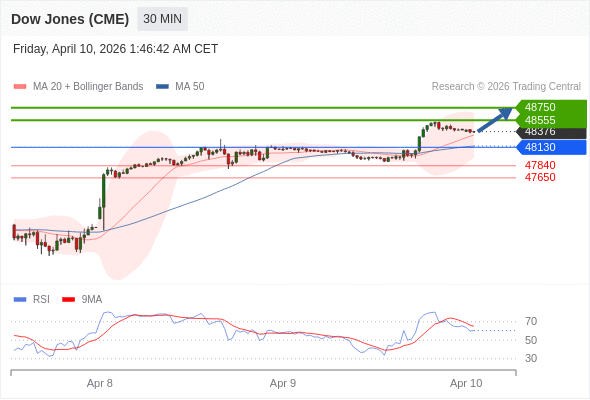 在 48130 之上,看涨,目标价位为 48555 ,然后为 48750 。