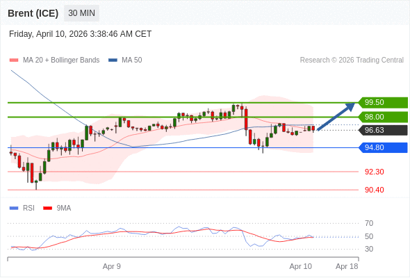 布伦特原油 (ICE) (M6) 当日内: 在94.80之上,看涨。