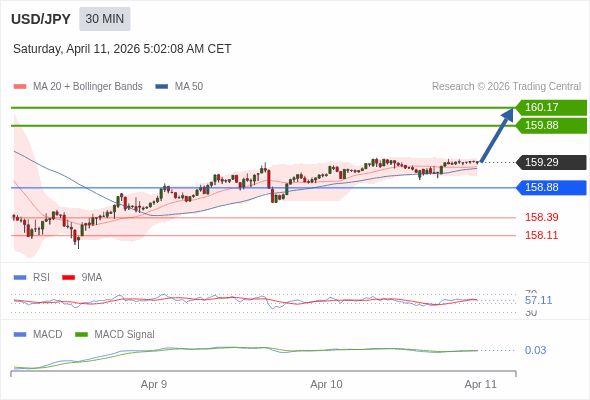 美元/日元 当日内 : 看涨,当 158.88 为支撑位。