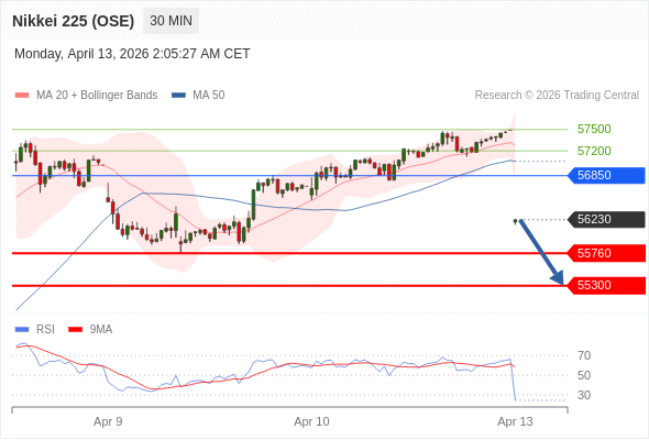 交易策略: 在 56850 之下,看跌,目标价位为 55760 ,然后为 55300 。