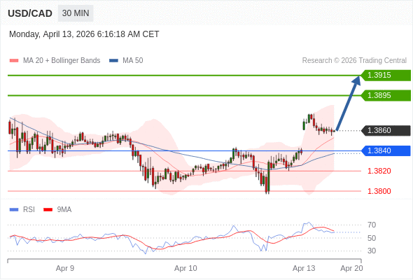在 1.3840 之上,看涨,目标价位为 1.3895 ,然后为 1.3915 。