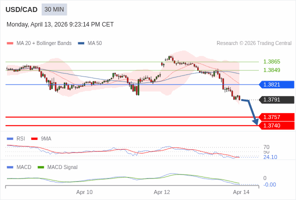 技术点评: RSI技术指标小于30。在这种情况下,说明有很强的下跌趋势,或者意味着处在超卖的状态下,可能会有向上的反弹。我们将观察RSI技术指标是否出现背离现象。 MACD技术指标处在其信号线之下看空。 配置为负。 此外,价位低于其20天及50天移动平均线 ( 分别位于1.3822 和1.3842 )。
