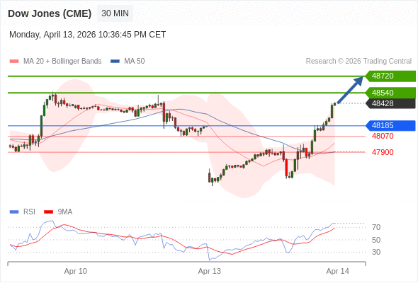 在 48185 之上,看涨,目标价位为 48540 ,然后为 48720 。