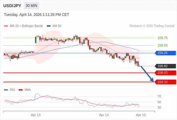 在 159.25 之下,看跌,目标价位为 158.60 ,然后为 158.30 。