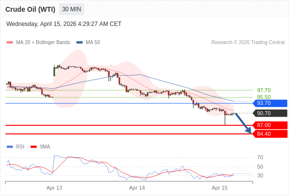 交易策略: 在 93.70 之下,看跌,目标价位为 87.00 ,然后为 84.40 。