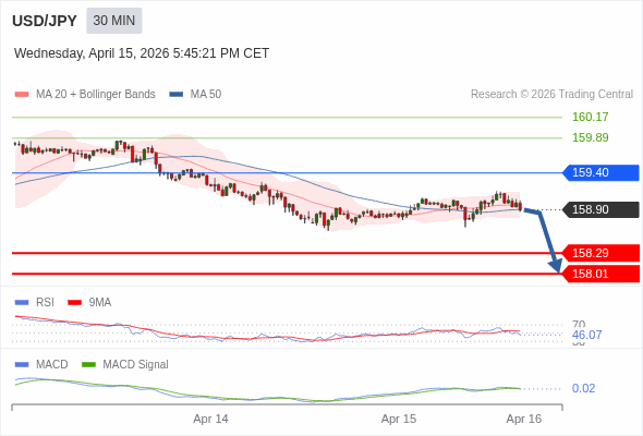 美元/日元 当日内 : 看跌,当 159.40 为阻力位。