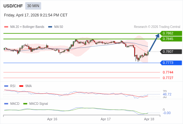 美元/瑞郎 当日内 : 有上涨的可能,目标价位定在 0.7862 。