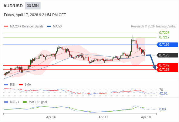 交易策略: 逐渐下跌,当 0.7199 阻碍上行,则 0.7138 为目标位。