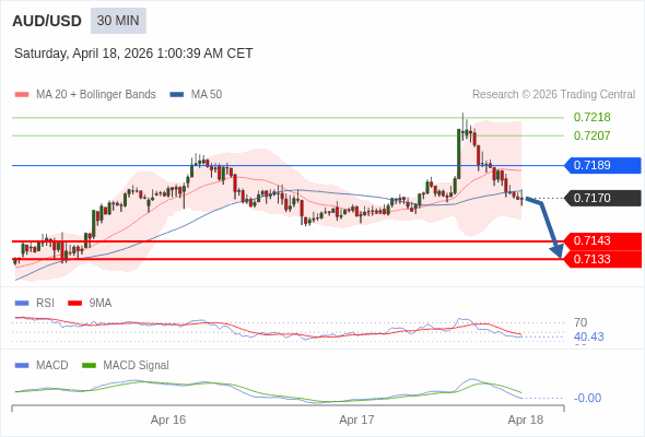 澳元/美元 当日内 : 看跌,在 0.7189 之下。