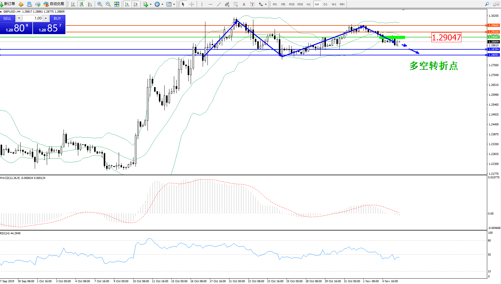 交易策略:1.29047下方看跌,目标1.283941.28091