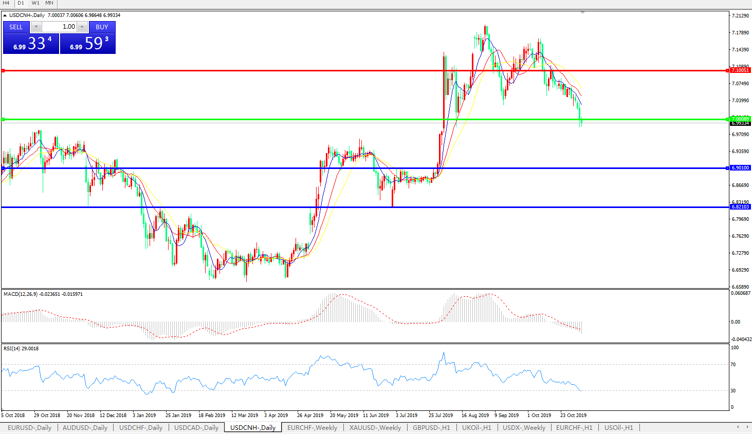 交易策略: 在7.0000之下,看跌,目标价位为6.9010,然后为6.8210。