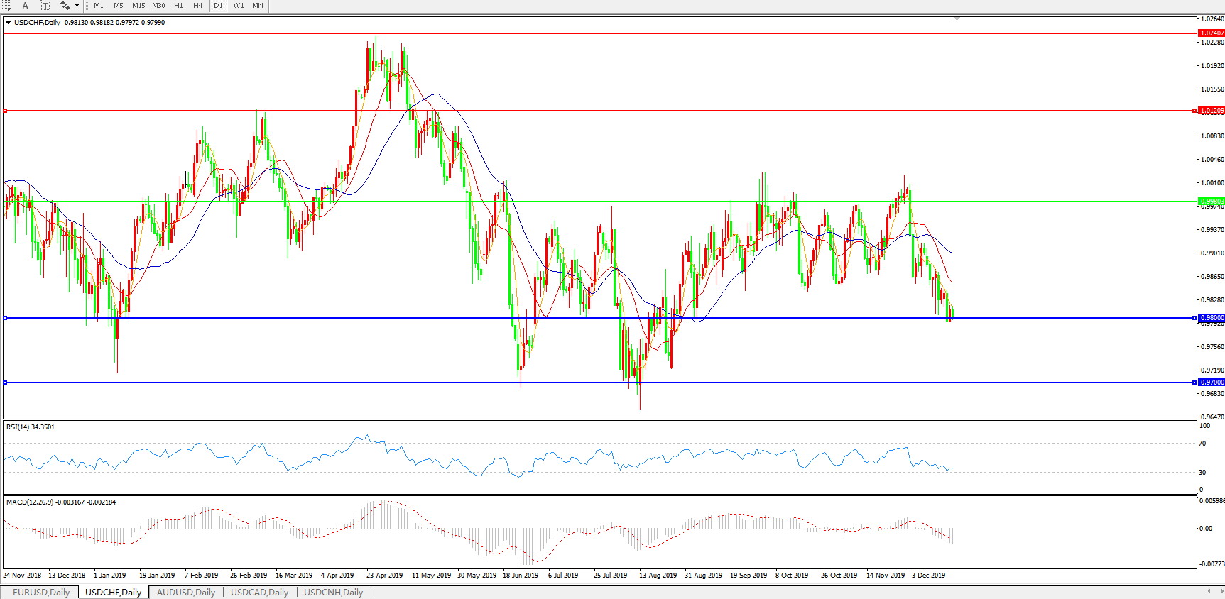 技术面简析:日线图均线呈有序空头排列,汇价再度下行试探0.98关口支撑,MACD运行于0轴下方且量能0轴下持续放量,RSI震荡走低,预计汇价存进一步下行空间。
