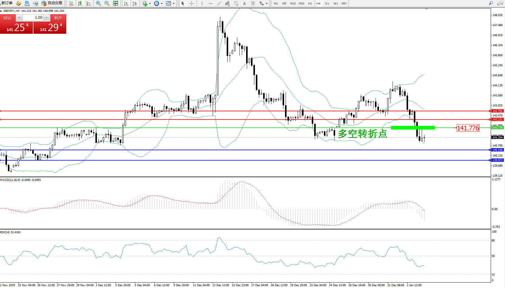交易策略:141.776下方看跌,目标140.546、139.973