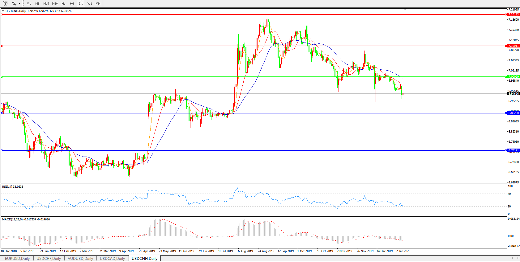 交易策略: 在7.0000之下,看跌,目标价位为6.8820,然后为6.7600。
