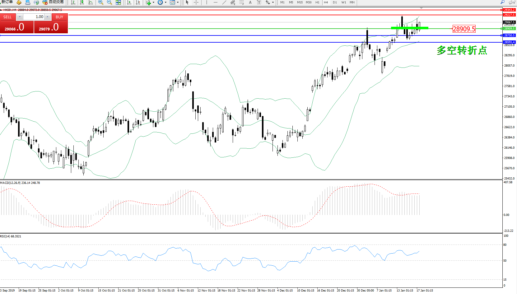 交易策略:28909上方看涨,目标29227、29343