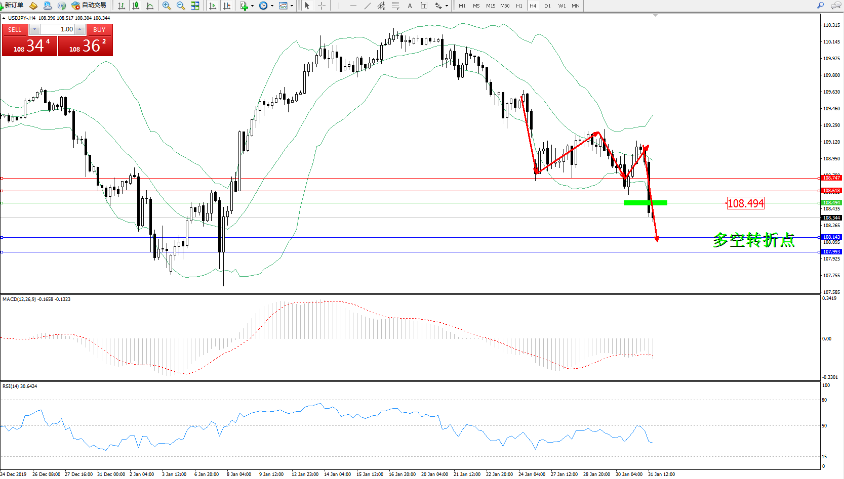 交易策略:108.494下方看跌,目标108.143、107.993