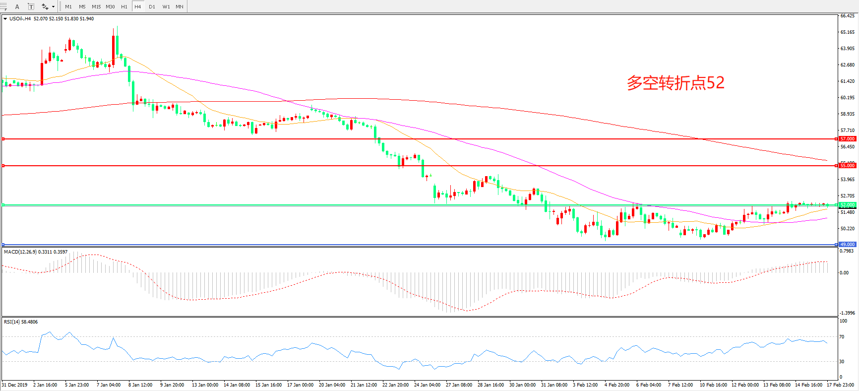4小时图看,美油波幅不大,52美金成为短期多空分水岭,整体走势有企稳迹象,短期均线拐头向上,MACD红柱增加,RSI指标走平,日内震荡上行概率较大。
