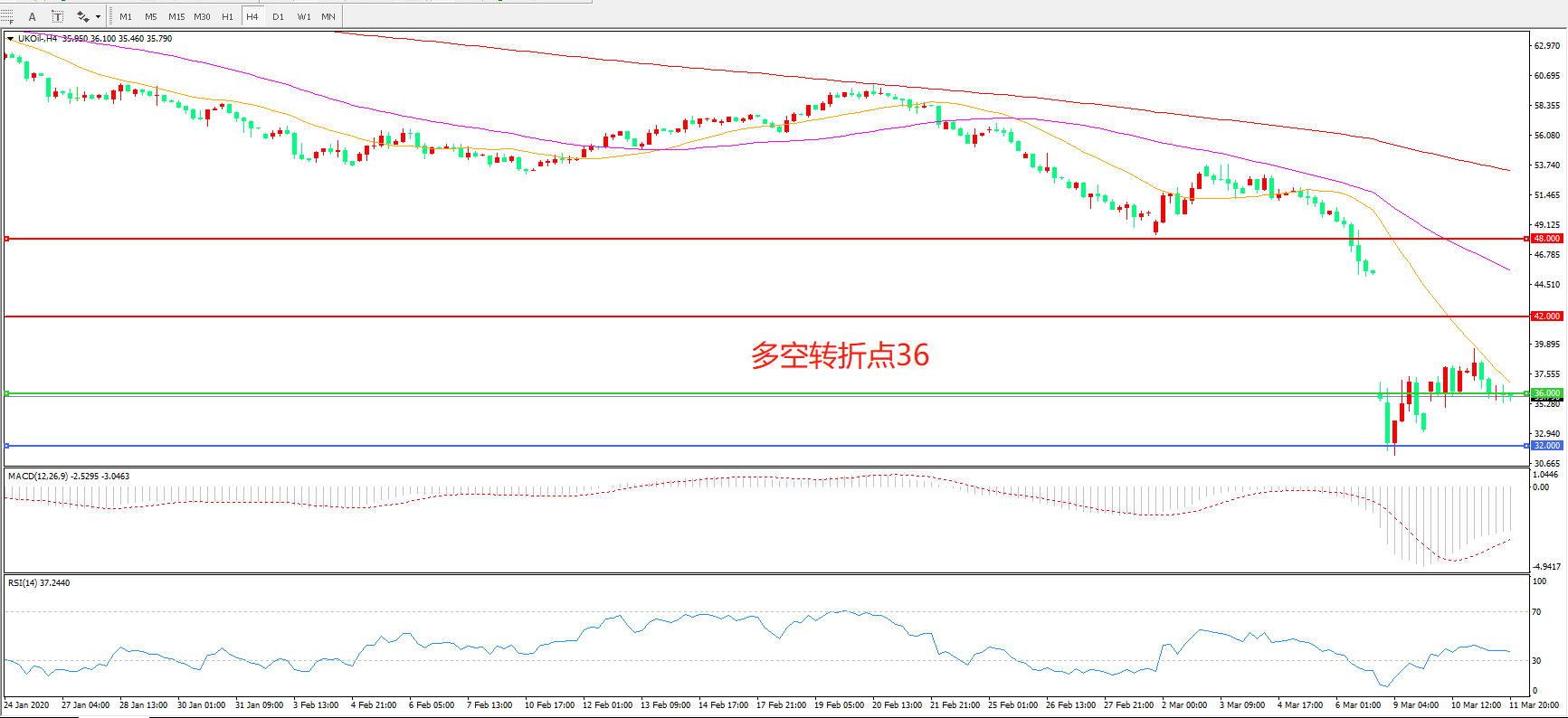 4小时图看,布油冲高后震荡回落,整体表现低迷,36美元成为短期多空分水岭,均线系统呈空头排列,MACD绿柱减少,RSI指标走平,日内延续震荡概率较大,中期走势仍然偏空。