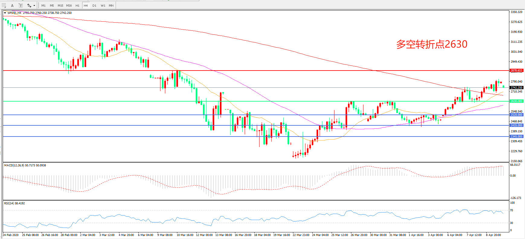 4小时图看,标普500震荡走高,短期走势有所回暖,200周期均线成为下方支撑,MACD红柱增加,RSI指标走平,日内震荡上行概率较大。