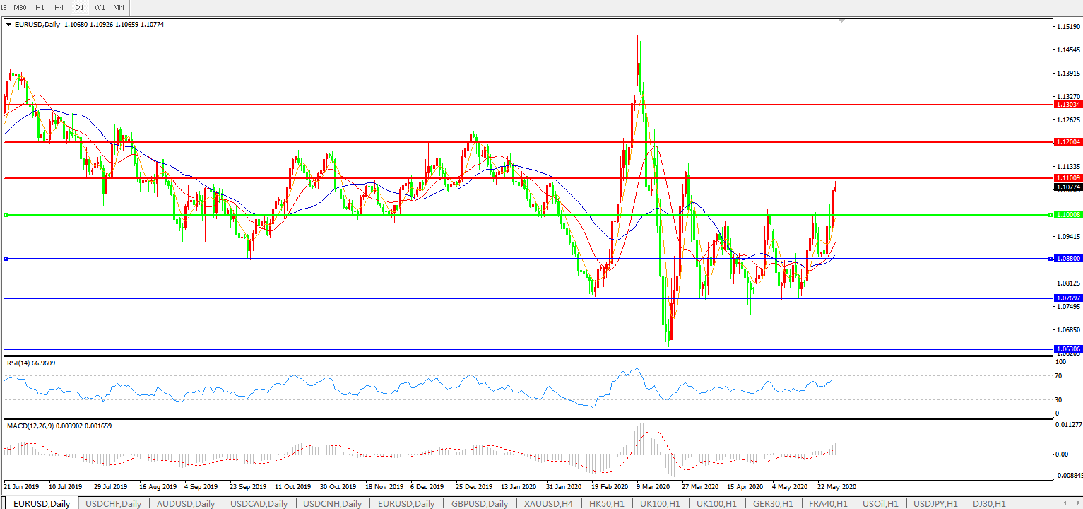 交易策略:1.1000上方看涨,目标1.1100、1.1200