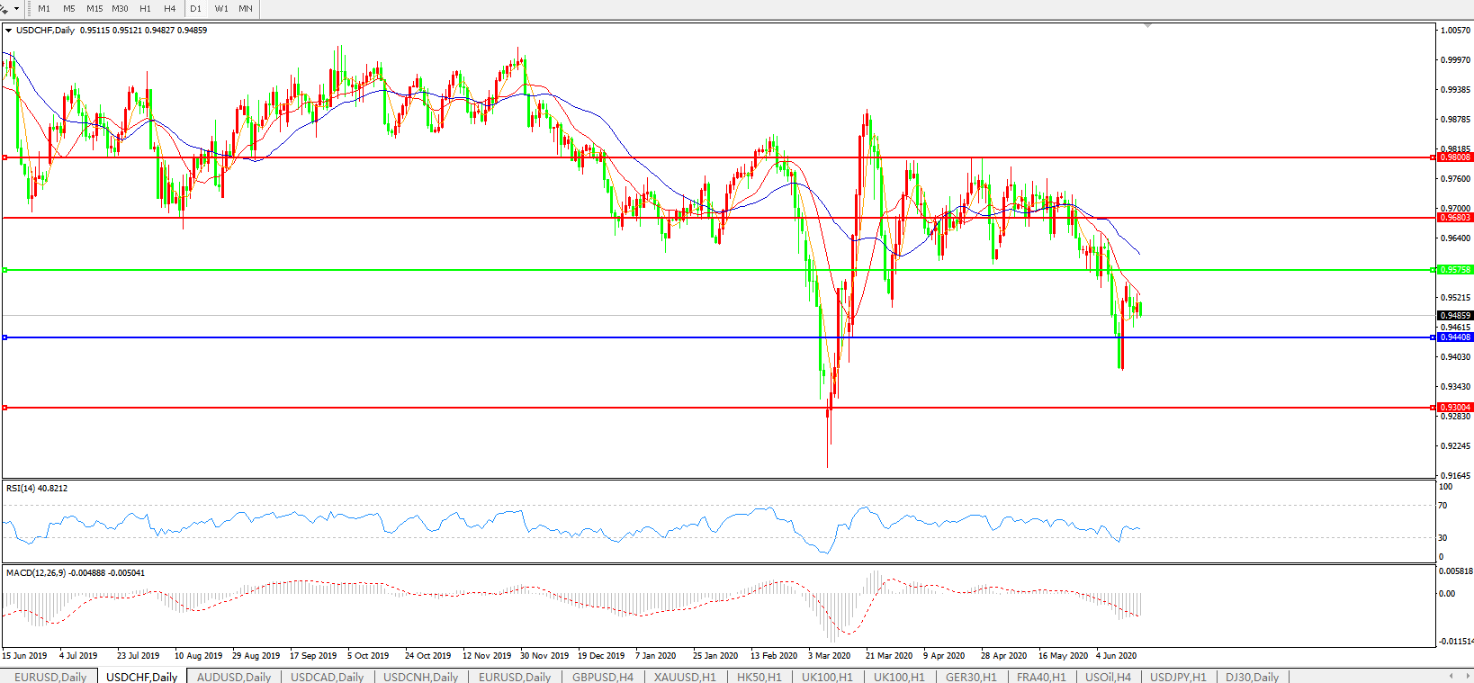 交易策略:0.9575下方看跌,目标0.9440、0.9300