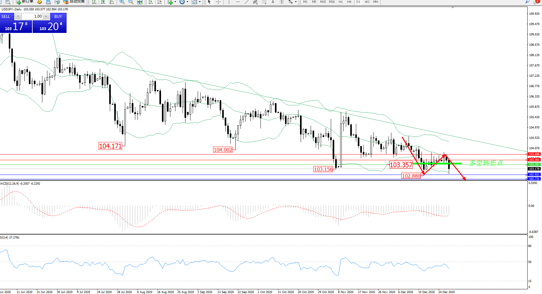 技术点评:空头动力延续布林带指标通道内中下轨区间持续震荡下行态势良好,底部抵达102.880位置后得到短暂支撑开始回升,但多头上扬动力欠缺,再度持续下行,纠结于布林带指标中下轨区间整理,布林带指标呈收口走势持续向下移动中,MACD指标处于0轴线下方空头区域维持整理平移中,RSI指标处于50均衡线下方空头区域维持窄幅整理有继续下移迹象;