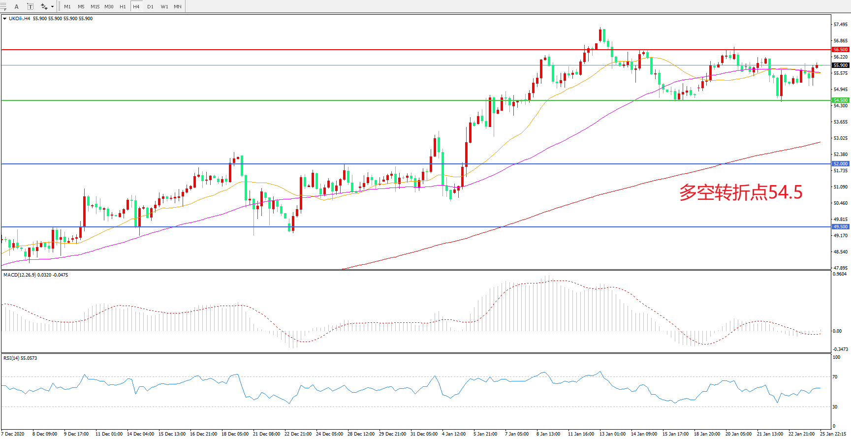 交易策略: 在54.50之上看涨,目标56.50 60.00