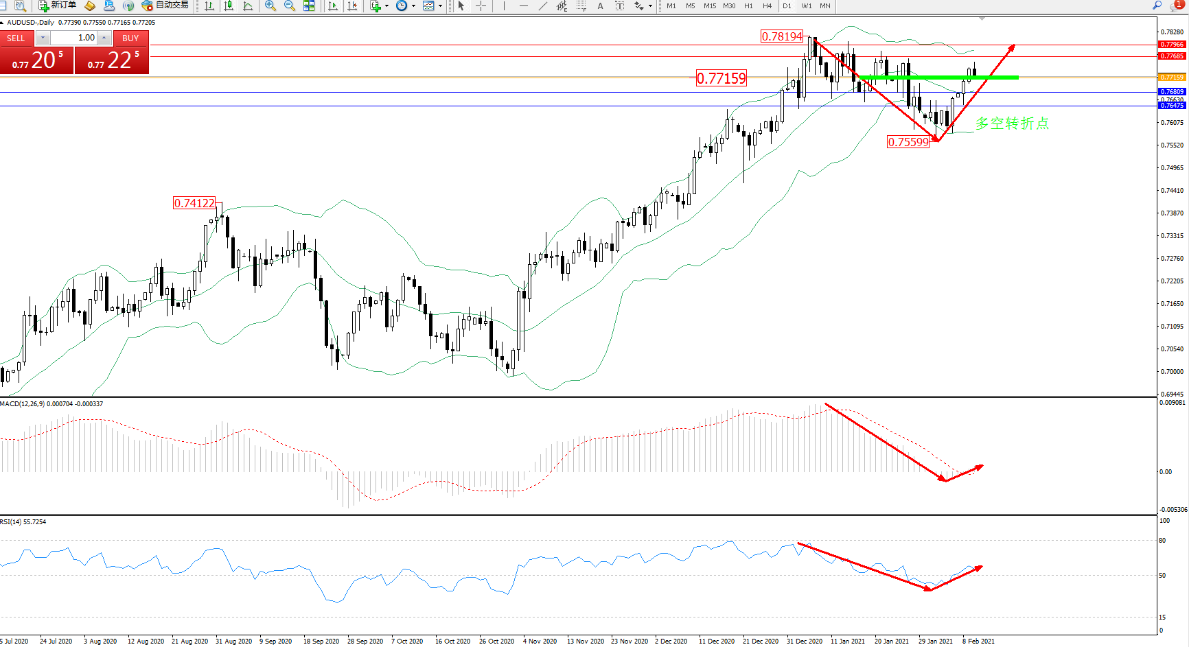 交易策略:0.77159上方看涨,目标0.77685、0.77966