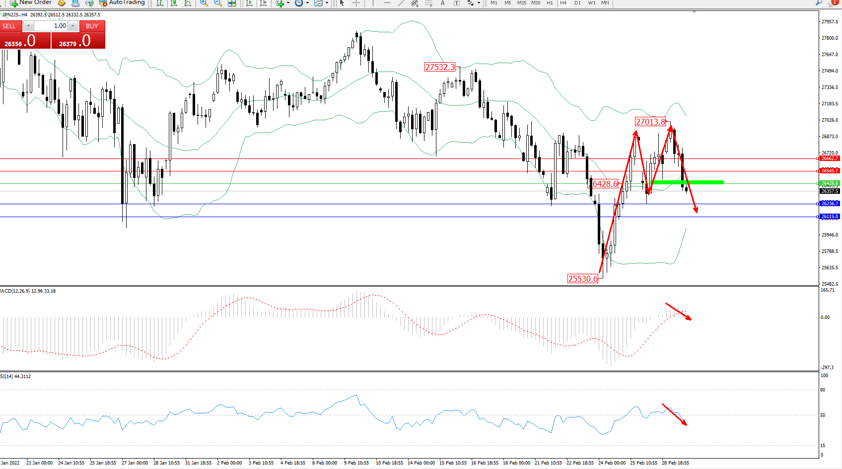 日经指数JPN225——4小时K线图显示: