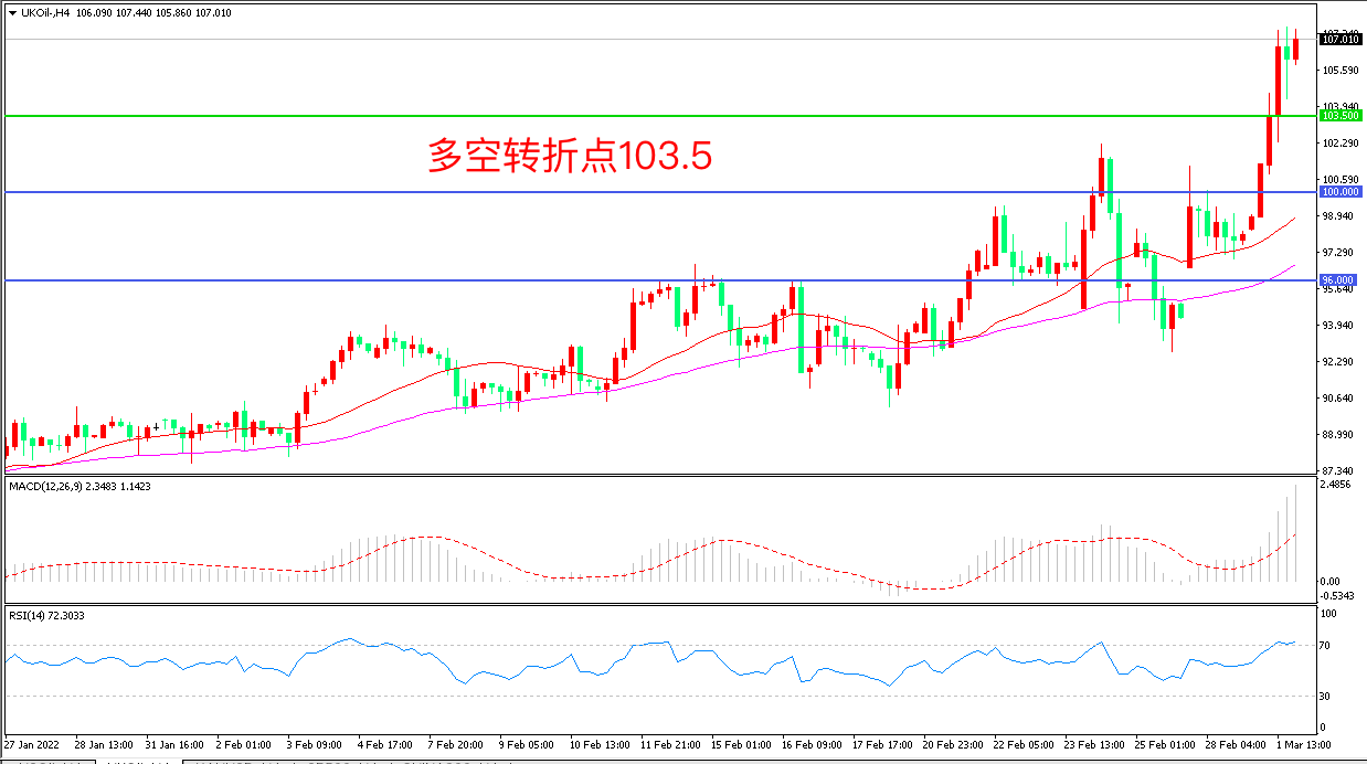 周二(3月1日),一方面担心俄罗斯可能释放紧急储备,另一方面担心俄罗斯能源出口中断,油价上演“疯狂时刻”布伦特原油飙升超过7%,收报107.10美元/桶,为2014年以来的首次。虽然美国政府和IEA释放油储的决定显示了石油消费大国遏制油价的决心,但市场更担忧俄罗斯供应中断这个风险,油价已进入非理性的上涨阶段。