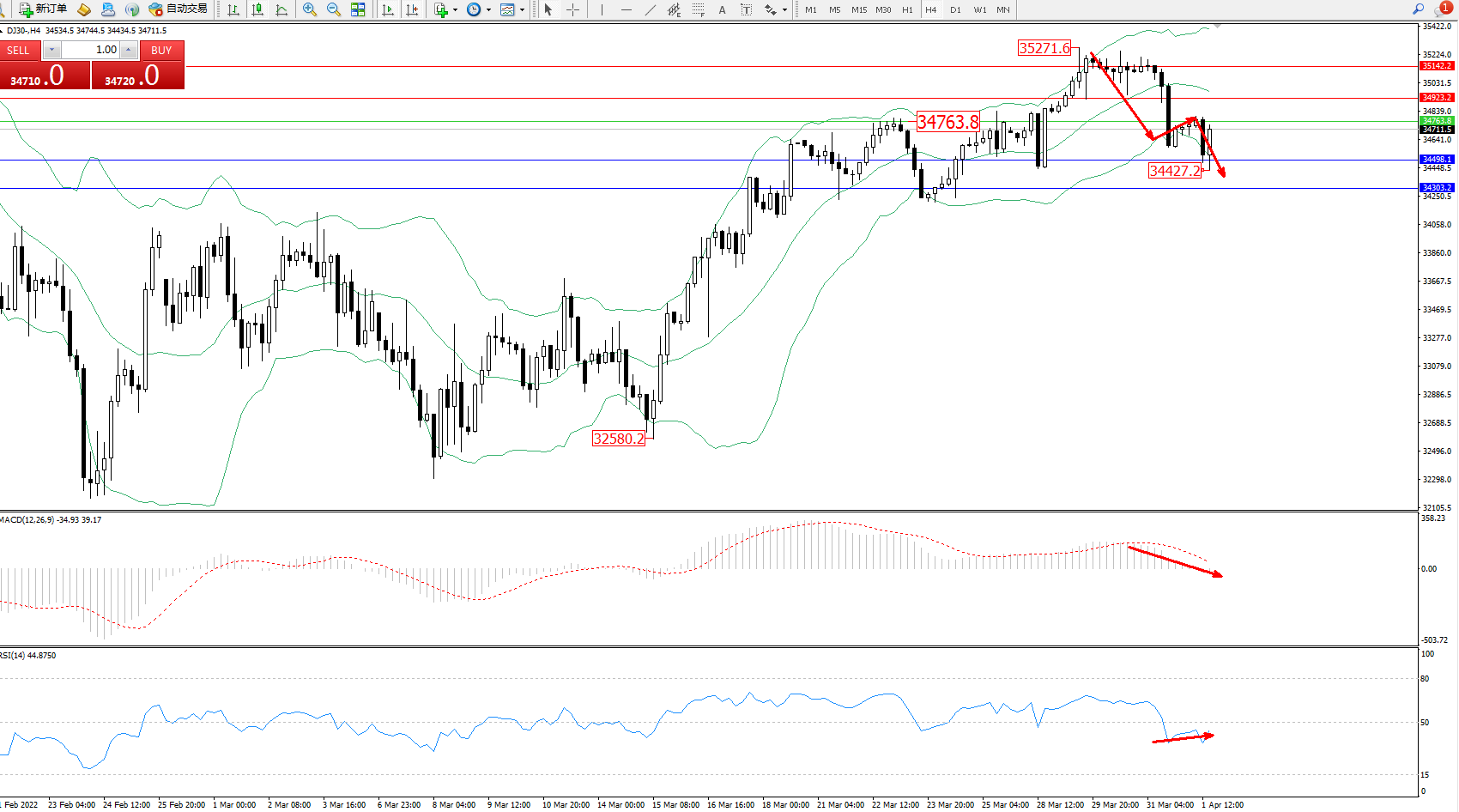 技术点评:高位空头动力呈阶梯式震荡下行,低位抵达34427位置后震荡回升,但市场整体下行趋势态势良好,布林带指标呈张口走势后开始逐渐扩大波幅,MACD指标处于多头区域维持0轴线附近弱势徘徊,RSI指标处于50均衡线下侧维持窄幅整理中;