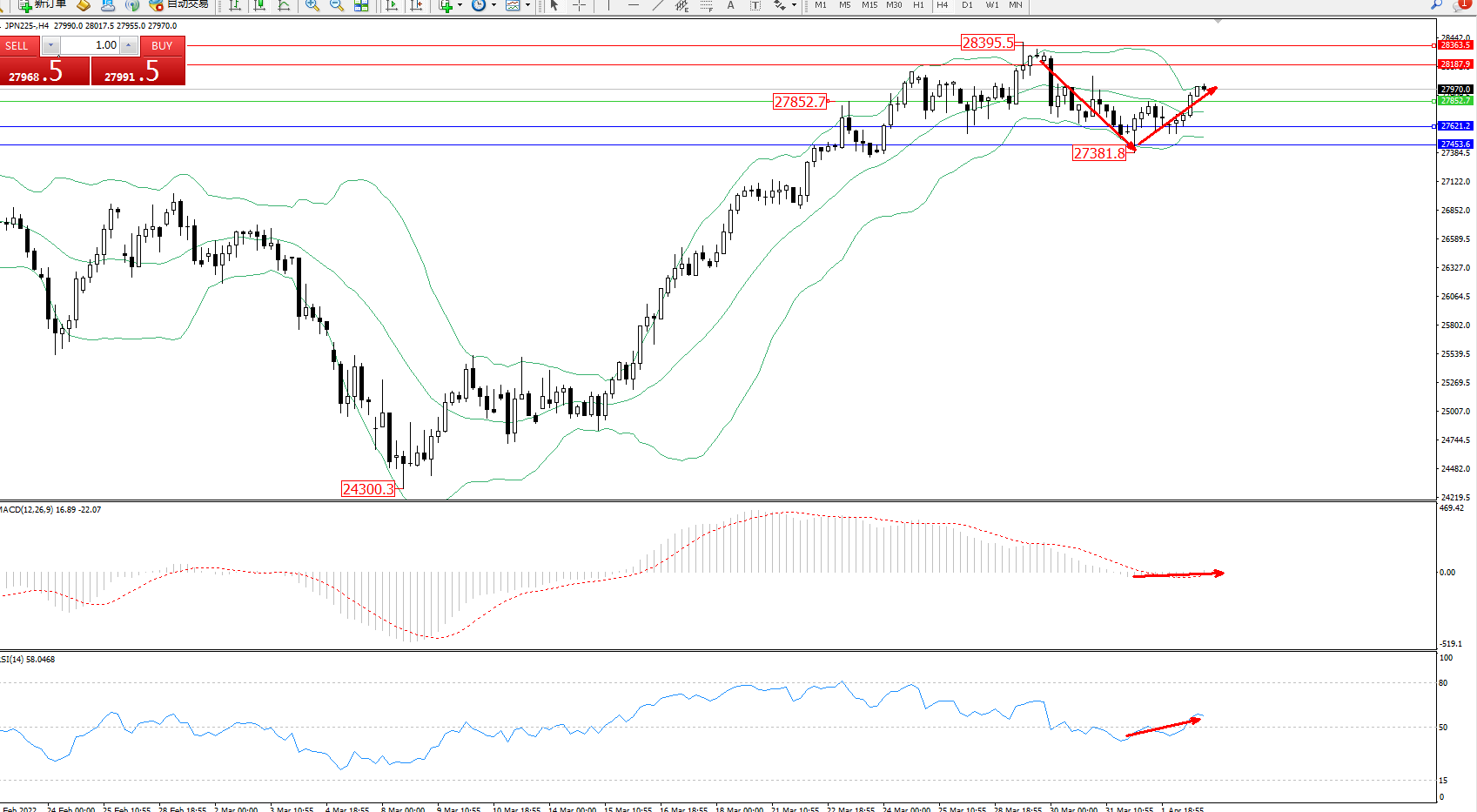 日经指数JPN225——4小时K线图显示: